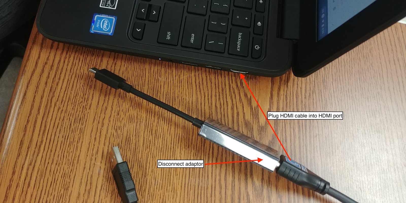 - Connect the HDMI cable into the Chromebook. Look for this cable (see picture below)